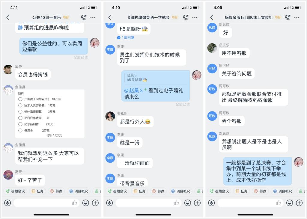 学生利用钉钉项目群模式开展小组讨论,教师可同时“在线围观”多个小组的发言情况。针对同学们的想法,随时给与鼓励或指正;学生遇到问题在群里@老师也会及时得到回复。讨论环节必须在规定时间内完成,利用限时规则激发学生主动性。这种分组自由讨论、多组平行开展的方式,大大提升了公关策划的效率,也方便老师督促学生更加投入课堂。