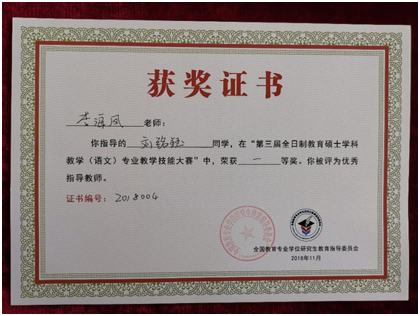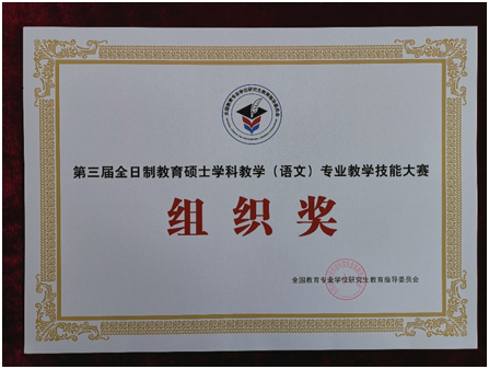 2018年11月17日至19日,由全国教育专业学位研究生教育指导委员会主办的第三届全日制教育硕士学科教学(语文)专业教学技能大赛在江西师范大学举行。来自全国的88所院校的315名学科教学(语文)研究生参加复赛,经专家评审选出120名选手参加决赛。我校与长春师范大学联合培养的两名研究生均进入决赛。其中刘铭钰荣获决赛一等奖,刘彦廷荣获决赛三等奖,学科教学(语文)导师团队李海凤老师被评为优秀指导教师。我校被全国教育专业学位研究生教育指导委员会授予第三届全日制教育硕士学科教学(语文)专业教学技能大赛组织奖。