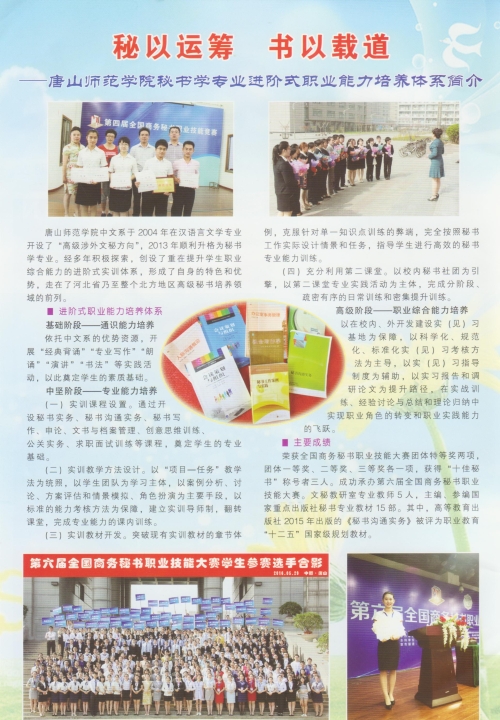 由教育部主管、兰州大学主办的《秘书之友》2016年第6期封二以《秘以运筹书以载道——唐山师范学院秘书学专业进阶式职业能力培养体系简介》为题,对我系秘书学专业进行了全面介绍。我系秘书学专业始创于2004年,2013年升格为独立专业,多年来师生共同努力,取得长足进步,教师主编、参编国家重点出版社秘书学专业教材15部,其中《秘书沟通实务》《书法》(高等教育出版社)两部教材获批为“十二五”职业教育国家级规划教材。学生三次荣获全国商务秘书大赛团体特等奖,多名学生获“全国十佳秘书”称号。学生就业率、考研率不断提升。