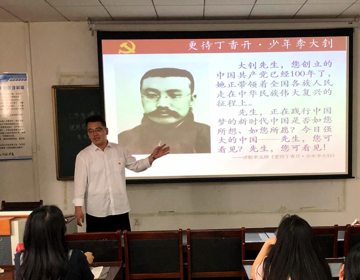 目前已获得天津师范大学中共党史专业硕士学位攻读资格的学生党员李安玟同志积极参与了此次活动的筹备和开展,她表示,历史对当下具有极强的关照作用,我们应牢记历史,为更好地经营当下、迎接未来而不断努力奋斗。学生党支部宣传委员马佳帅同志正在参演由唐山市文明办、唐山演艺集团、唐山师范学院主办的评腔单元剧《更待丁香开·少年李大钊》,他结合自己的表演经历为大家带来了少年大钊的故事,他表示,革命先烈的精神品格值得我们每一个人敬仰,能够给予我们无穷的力量。