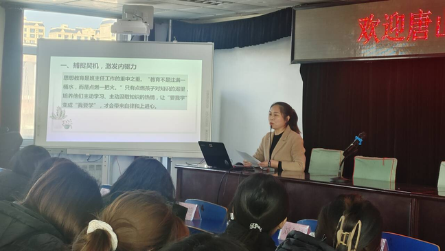 玉田三中的孟庆霞和甄丽敏两位老师首先介绍了班主任管理经验。孟庆霞老师作了题为《春风化雨育桃李,润物无声守初心》的报告,从四个方面分享了班主任工作的经验:第一,捕捉契机,激发内驱力;第二,制胜法宝,勤字当头;第三,巧用表扬,树立榜样;第四,携手共育,一路生花。