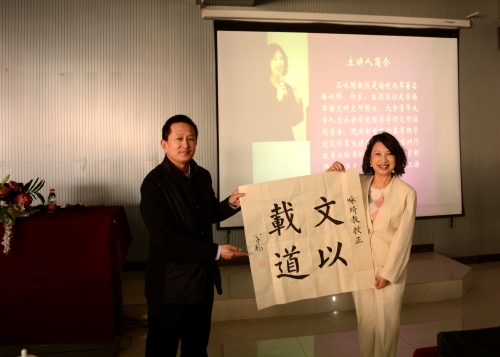 2018年4月10日,中文系邀请台湾学者、首都师范大学客座教授石咏琦教授在图书馆学术报告厅举行了一场主题为《从八大管理谈秘书成长与未来发展》的学术讲座。中文系党总支书记张学鹏、文秘教研室全体教师和秘书学专业学生100多人参加了讲座。讲座由文秘教研室主任陈伟莲主持。张学鹏教授向石咏琦教授赠送了书法作品,石咏琦向中文系回赠了学术专著。