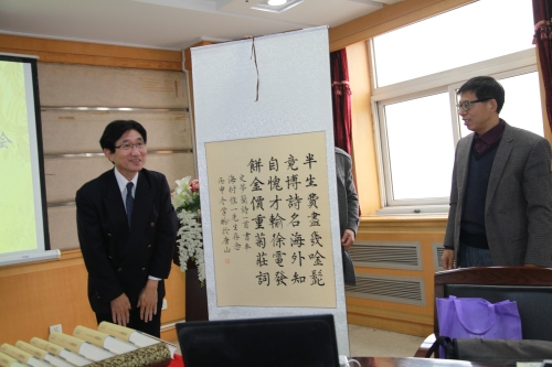 开幕式最后,会议主办方向日本学者海村惟一教授赠送了一幅由中文系党总支书记张学鹏教授书写的书法作品。该作品由史梦兰创作:“半生费尽几吟髭,竟博诗名海外知。自愧才输徐电发,饼金价重菊庄词。”史梦兰的《全史宫词》在其生前就传播到朝鲜和越南,其《燕说》在日本学术界也有重要影响。这首绝句用来赠与海外学者,也是恰逢其时。海村惟一教授非常高兴,表示要作为“镇馆之宝”珍存。