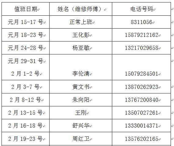 寒假临近,现将寒假期间水电维修小修安排通知如下,请需要进行水电小修的用户按照安排表拨打维修人员电话。