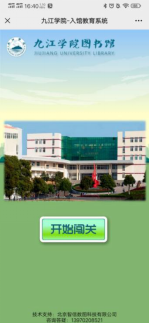 1.微信扫码关注“九江学院图书馆”微信公众号(账号“jjxy_tsg”),点击右下角“读者服务——新生入馆教育游戏闯关”进入。