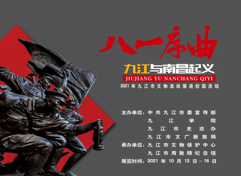为学习贯彻习近平总书记“七一”重要讲话精神,深入开展党史学习教育,大力传承红色基因,赓续红色血脉,着力培养担当民族复兴大任的时代新人,由中共九江市委宣传部、九江学院、九江市史志办、九江市文广新旅局主办,九江市文物保护中心、九江市周敦颐纪念馆承办的“八一序曲——九江与南昌起义”主题展览将于2021年10月12日~16日在我校艺术学院大楼一楼大厅举行,欢迎广大师生前往参观。