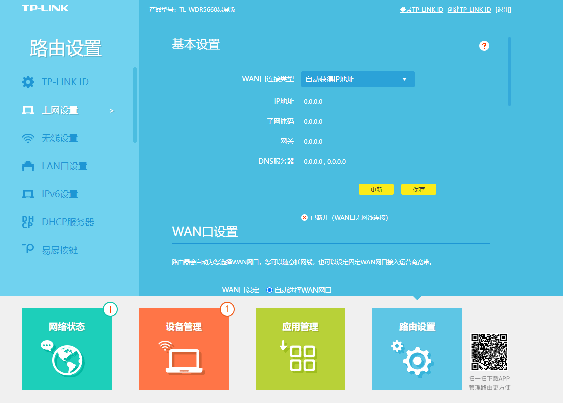 第三步:在“上网设置”选项中,WAN口连接类型中选“自动获得IP地址”, 再选择下面的“保存”选项,进行保存设置即可。