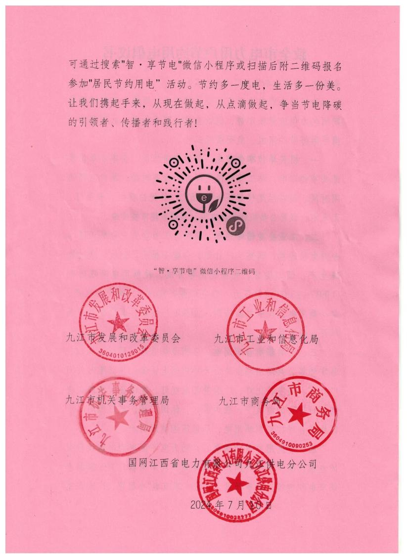 电是生命的光环。节约用电更是传统美德。节约不仅是美德,更是品质,是责任,是一种境界。“历览前贤国与家,成由勤俭败由奢”。让我们同心协力,做勤俭节约风尚的传播者、实践者、示范者,让“节约光荣,浪费可耻”的理念蔚然成风,用实际行动为祖国、为社会、为校园尽一份力量!接九江市发展和改革委员会、九江市工业和信息化局、九江市机关事务管理局、九江市商务局、国网江西省电力有限公司九江供电分公司联合倡议通知,让我们一起从自身做起,从节约一度电开始,创节约型校园,展和谐校园新貌!为此,我们提出以下倡议: