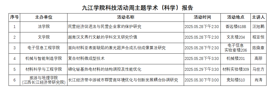 为深入学习贯彻习近平总书记关于科技创新的重要论述,广泛宣传习近平总书记对科技工作者关心关爱,推动落实党中央科技创新重大决策部署,大力倡导科学家精神,宣传推广基础学科知识,在全校形成浓厚的科技文化氛围,激励全校师生坚定信念,开拓进取,根据2025年全省科技活动周安排,学校决定于5月27日——5月30日期间组织开展九江学院科技活动周系列活动。现将有关事宜安排如下: