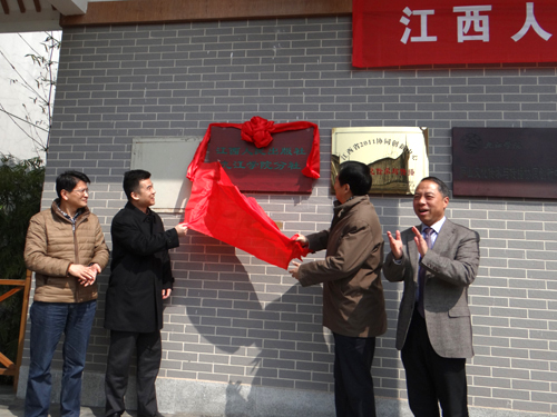 在热烈的掌声中,校党委书记郑翔,校长甘筱青,江西省出版集团公司副总经理、中文传媒股份有限公司总经理傅伟中,九江市文化广电新闻出版局局长柯亨龙共同为学院分社揭牌。江西人民出版社九江学院分社正式宣告成立。