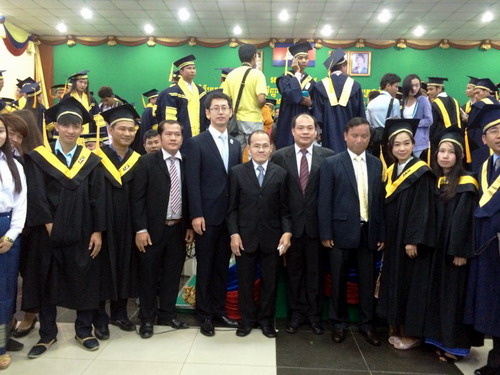 5月11日,柬埔寨亚欧大学举行2015年度毕业典礼,柬埔寨政府洪森总理(H. E. HUN SEN)发表演讲并亲自为毕业生代表颁发毕业证书。