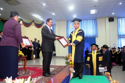 洪森为毕业生代表颁发证书