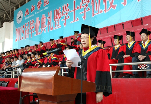 毕业生代表、校十佳大学生、叔子爱莲奖学金获得者、理学院A1141班金晨鑫同学代表2015届一万余名毕业生向母校表达了发自内心的深情谢意,她说,母校,我们爱你。爱你美丽如画的校园,爱你浓郁的学习氛围,爱你给了学会了坚强和担当的四年。母校,我们敬你。母校见证了我们的成长,给了我们丰富多彩的大学文化生活。母校,无论我们身处何方,我们还将坚持爱你。他们母校承诺:一定时刻秉承“竞知向学,厚德笃行”的校训精神,严以律已,真创实干。一定谨记母校的谆谆教诲,品味经典,陶冶情操,养成良好习惯,坚持锻炼,练就一个好身体,坚持创新创业,用青春激荡梦想,将母校九江学院永远铭记在心中。衷心祝愿母校永葆青春,再谱华章!