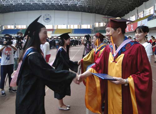 接着,在庄严神圣的气氛中,举行了隆重的学位授予仪式。伴随着欢快的音乐,身着鲜红导师服的全体校领导健步走到列队等候的毕业生队伍前,亲手为48名身着学士学位服的学生代表一一正冠拨苏,并与他们握手和合影留念。庄严的学士服与张张青春朝气的笑脸交相辉映,豪情壮志激荡在每位毕业学子的心中。阳光自信的九江学院学子,身着端庄稳重的学士服,整装待发。鞠躬、握手、拥抱,他们用最真诚的方式来感谢母校、感谢师长,他们用最动人的微笑为大学四年的学习历程划上了圆满的句点。