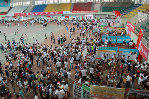 为方便提前来校的新生报到,学校的迎新工作9月3日下午就已经开始。9月4日清晨迎新工作全面展开。5点30分,学校13辆迎新校车分赴九江火车站、庐山火车站和九江长途汽车站,迎接新同学和家长到各自校区报到。当校车驶入报到现场时,早已等候在这里的迎新工作人员和志愿者高举着各个学院的引导牌在车门处热情地招呼着自己学院的学弟、学妹,带领他们到学院接待点存放行李、办理各项报到手续。