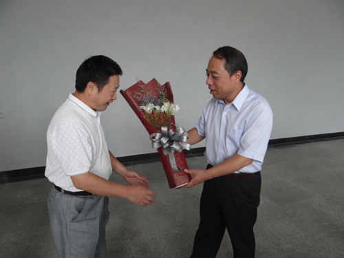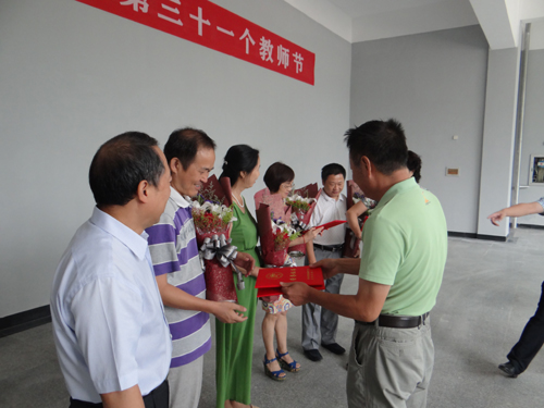 在新落成的教职工活动中心一楼大厅,甘筱青校长等校领导向学校从教三十年以上教师代表颁发了荣誉证书和鲜花,并向他们致以节日的问候。