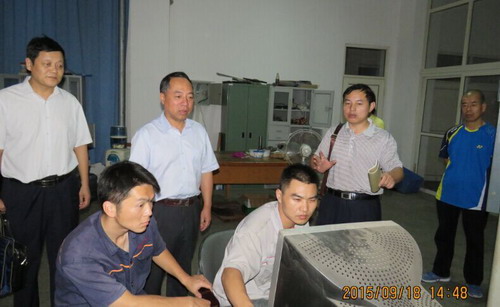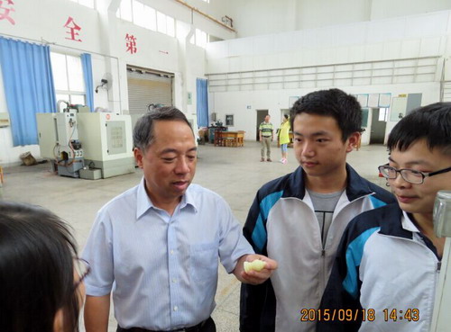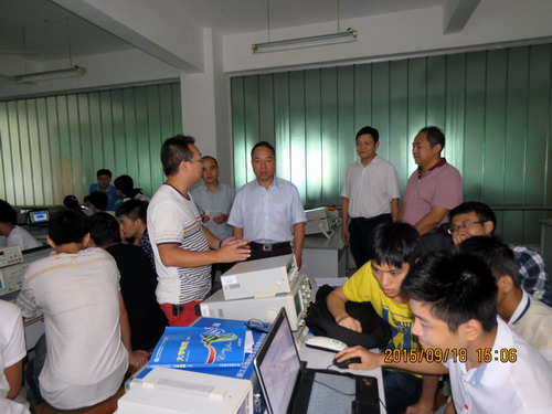 9月18日下午,甘校长在教务处长马明亮、宣传部副部长陈晓松的陪同下来机材学院检查金工实习教学工作,并来到电子信息实验楼302实验室,与电子学院A1441班同学一起听取了吴华杰老师指导的《基本电路课外能力拓展训练》实践课程。机材学院院长张德勤、副院长王英惠、李养良一同检查,电子学院院长高小英、副院长张友木一同听课。