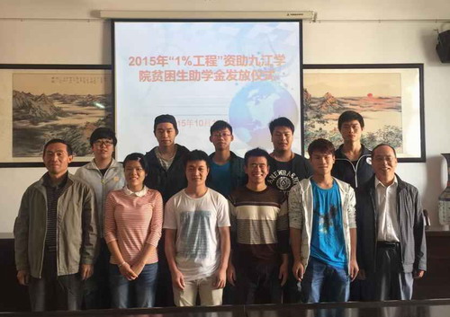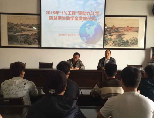 10月13日上午, 2015年度“1%工程”资助九江学院贫困学生助学金发放仪式在我校厚德楼415会议室举行。校学生资助管理中心主任潘建华,民进九江市委会副主委、九江学院总支主委赵追和本次受到资助的学生出席发放仪式。