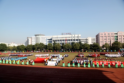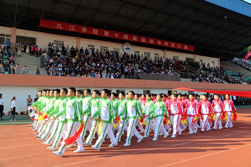 青春的脚步,快如金秋之风;绽放的笑容,灿若春晓之花。10月15日上午8时,秋风送爽,丹桂飘香。操场上彩旗招展,红旗飘扬。九江学院第十四届田径运动会炫彩开幕。校领导郑翔、甘筱青、纪岗昌、王万山、陶春元、杨焱林、魏立平、杨耀防出席开幕式并在主席台就坐。第十四届运动会组委会全体成员和万余名师生代表参加了开幕式。开幕式由第十四届运动会组委会副主任、副校长陶春元主持。