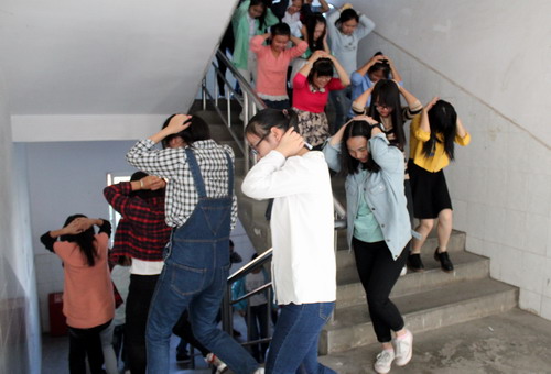 随着张晓明处长宣布“消防防震演练正式开始”,同学们在老师的指挥下弯腰、双手抱头、顺着墙壁按照预定的疏散路线以最短的时间、最正确的方法,紧张有序的快速撤离到指定的安全地带,并清点人数。