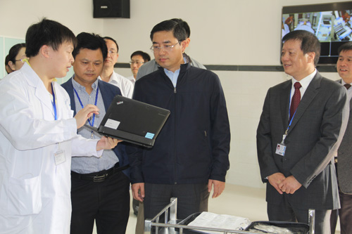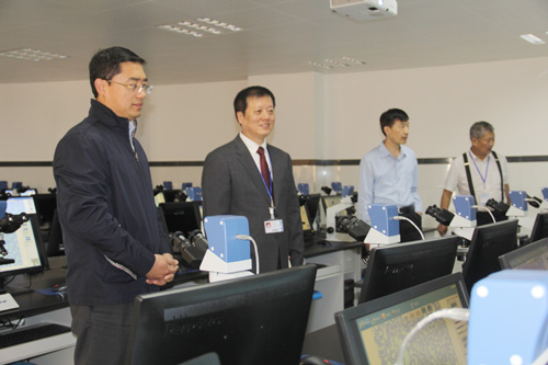 紧接着,专家组分别对医学技能训练与考核中心、临床实验教学中心、教学楼、重点科室、医学科研中心等处进行了实地走访和教学观摩。在焕然一新、改造升级的临床实验教学中心,专家组成员在陶副校长、临床医学院/附属医院党政领导的陪同下,考察了显微互动实验室、标准化实验室、影像诊断实验室、模拟产房、多功能中央监控室、模拟ICU和外科实验室等,重点观摩了高级产妇综合模拟人自然分娩,外科消毒铺巾、洗手穿衣,影像读片等实验项目,对ICU实验室的高端智能综合模拟人进行了了解,对中央监控室的功能进行了考察。实验中心门类齐全、设备先进、功能完备、环境整洁,各实验带教老师讲解全面,得到了专家的好评。