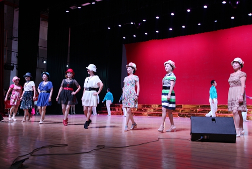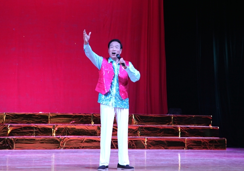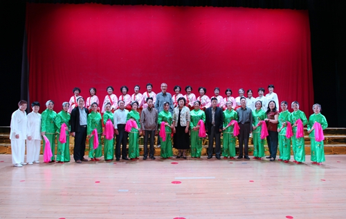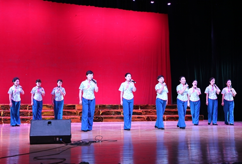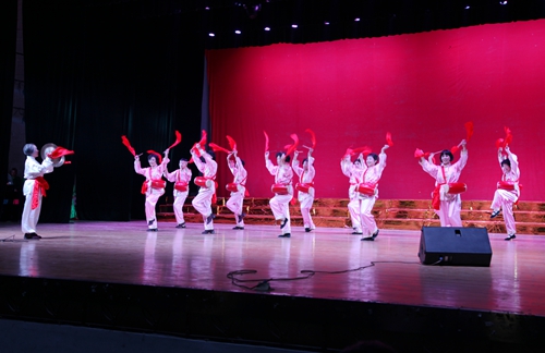 汇演结束后,吴桃娥和相关部门负责同志走上台慰问演职人员,并合影留念。