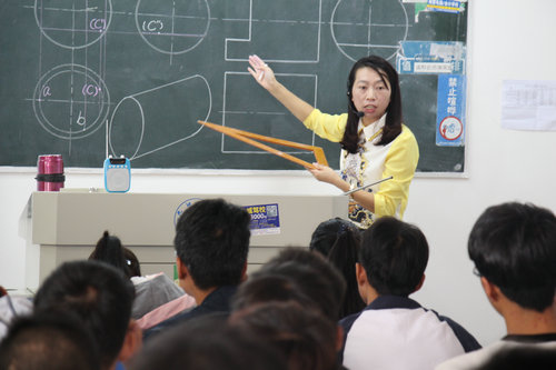周玉华老师本节课讲解内容是上节课知识——《曲面立体及表面上的点和线》的作业。她对每项作业解答步骤进行了详细、清晰的讲解,同时启发和引导学生思路,令同学们更易于理解。吴桃娥副校长与同学们一起专注听课,并认真地做着听课笔记。