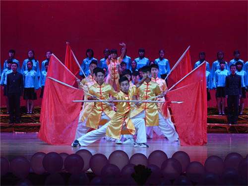 晚会紧紧围绕着学校三大特色教育展开,同学们在欣赏节目的同时,也能感受到节目内含的深刻教育意义。一群笑靥如花的姑娘们用热情给大家带来了充满异域风情的新疆舞《花儿为什么这样红》将晚会拉开序幕。在校运会上取得优异成绩的啦啦操队、健美操队和街舞队分别带来活力四射、充满青春与力量的表演,力与美的完美结合告诉同学们“走下网络、走出宿舍、走向操场”积极学习运动技能、培养好习惯的重要性。