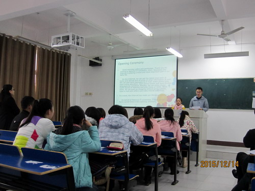 赵宋文老师采用PPT方式,讲授了“Public Speaking”内容。她通过实际案例,说明了对于口译者来说公共演讲技巧的重要性,影响公共演讲的因素,以及如何克服怯场等;通过分组方式,让学生到讲台上实际操练新闻播报,天气预报,公司产品介绍,开幕式讲话等内容,让其他学生充当评委,然后讨论各组的优点和不足。课堂上师生互动频繁,气氛活跃,很好地激发了学生学习兴趣,培养其合作精神和竞争意识。