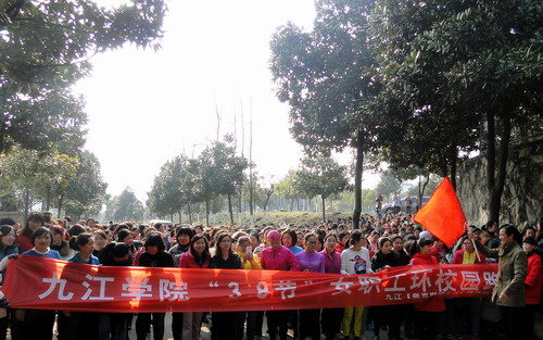 一路上,大家精神抖擞,大步向前,整个活动现场气氛热烈,巾帼女英雄们个个积极踊跃,热情参与,充分展示了我校女教职工团结、奋进、自尊、自信、自立、自强的精神风貌。在环校跑队伍中,有一支特别的队伍,她们是离退休女教工,她们精神焕发,健步如飞,风采不减当年,成为一道亮丽的风景线。活动过程中,年长的女教职工和许多女青年教师一起,满怀信心地向目的地跑去。大家自始至终精神抖擞,朝气蓬勃,充分展现了九江学院人奋发向上、团结一致的精神。虽然气温较低,寒气袭人,但是广大女教职工们在这个属于自己的节日里,参与活动的热情丝毫不减,她们一路欢声笑语,一直坚持到了环跑线路的终点。