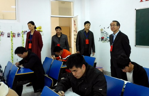 省市巡视员在副校长陶春元、教务处处长马明亮、副处长漆晗东、外语学院副院长柴克清的陪同下对考场进行了巡视。