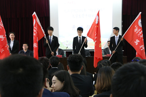仪式上,学生处处长刘平就2016年学生骨干培训班作了具体安排。与会领导为“大骨班”四个班级进行了授旗。学员代表“竞知班”班长会计学院田妙龄同学作了表态性发言。