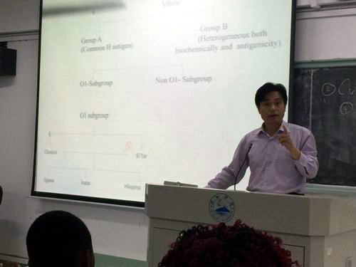 课堂上,HUSSAIN老师讲述了细菌中弧菌的特点和性质,详细解释和解答学生们在课程中遇到的问题,学生们全神贯注,认真记录,课堂气氛活跃。