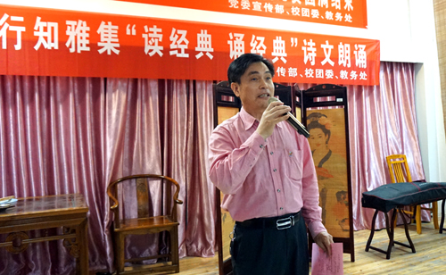 当晚,在聆听完同学们的朗诵后,副校长杨耀防对朗诵会进行了点评,他希望同学们带着诗样的情趣学习、生活,让那些经久不衰的经典诗文滋养性情,让高雅的爱好陪伴自己终生。随后,杨耀防副校长朗诵了他自己创作的诗歌,赢得了同学们热烈的掌声。