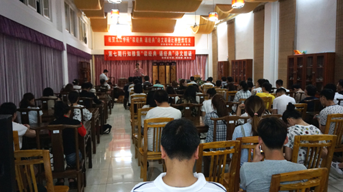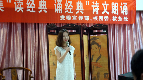 6月7日晚,在古香古色的旅游学院茶艺实验室,在同学们的热烈掌声中,“读经典 诵经典”诗文朗诵会举行。14名在“读经典 诵经典”诗文朗诵比赛中获十佳或优秀的选手带来了精彩的朗诵。《祖国,我亲爱的祖国》、《少年中国说》、《水调歌头》、《满江红》、《送别》、《楼兰新娘》、《再别康桥》等一首首耳熟能详、脍炙人口的经典诗篇,经同学们的演绎,给现场听众以美好的视听享受,使观众在感受声音艺术魅力的同时,体会经典作品的内涵和意境。副校长杨耀防以及党委宣传部、校团委、教务处、旅游学院等部门和二级学院的负责人参加了朗诵会。