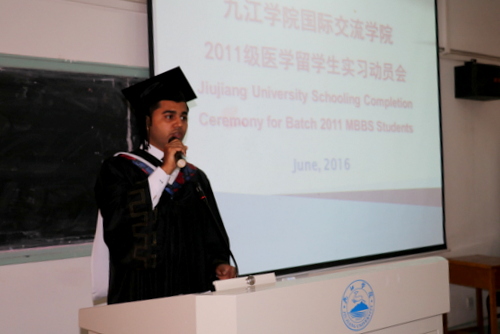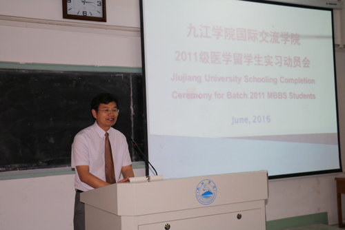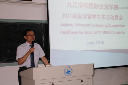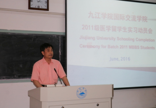 国际交流学院院长夏修龙代表国际交流学院致辞,他感谢留学生选择来九江学院学习,并对如何做一个合格的医学实习生提出了建议。