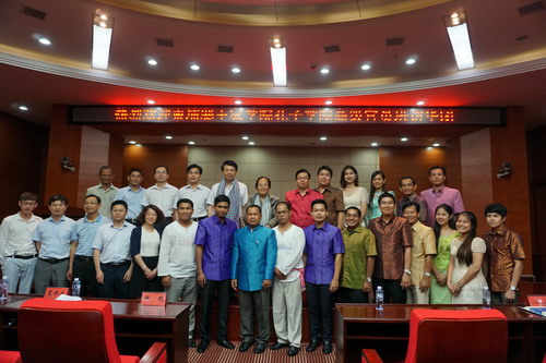 6月22日,以柬埔寨王家研究院院长、孔子学院理事长克洛媞达(H.E.KHLOT THYDA)为团长的柬埔寨孔子学院高级官员班访华团来我校访问交流,学校在逸夫图书馆报告厅举行了简单而热烈的欢迎仪式。校党委书记郑翔、副校长杨耀防、国际交流学院院长夏修龙、外国语学院院长韩琨、文传学院院长吴国富、旅游学院院长李松志以及部分师生代表和柬埔寨奖学金生等共50余人出席了欢迎仪式。仪式由国际合作交流处副处长王贤淼和孔子学院院长谢莫尼勒(H.E.CHEA MUNYRITH)共同主持。