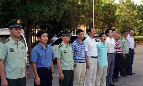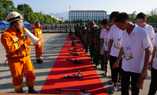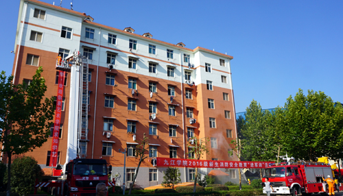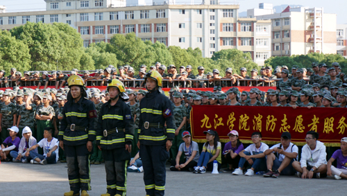 9月13日下午,九江学院2016级新生消防安全教育“进军训”活动在学生宿舍34栋举行,校纪委书记魏立平、九江市消防支队支队长廖圣福、防火处长袁杰、濂溪区消防大队长江猛、教导员刘小敏、消防支队警务科长周波出席活动,保卫处、学生处及部分二级学院负责人以及军训新生3000余人参加活动。