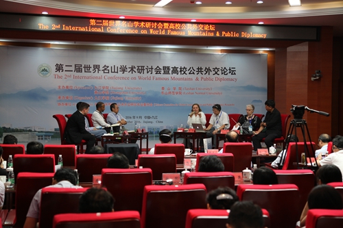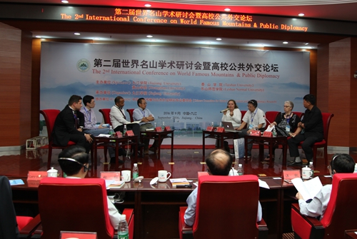 开幕式之后,举行了圆桌论坛。中国人民大学公共外交研究院副院长雷蔚真主持圆桌论坛,华中科技大学新闻与信息传播学院院长张昆,浙江大学传媒与国际文化学院院长吴飞,清华大学新闻与传播学院副院长周庆安,世界名山协会大洋洲副秘书长杨娜,世界名山协会南美洲副秘书长、塞阿拉州联邦大学教授莫妮卡,世界名山协会非洲副秘书长、南非国家公园负责人盖瑞,罗马尼亚欧洲山脉协会会长米哈尔.安德烈参加了论坛讨论。圆桌论坛上,8名中外专家学者分别“从概念的关联性探讨名山与公共外交的关系、从学理上阐述名山在公共外交中有哪些特殊作用、用一句话概括名山与公共外交的关系”三个层面阐述了名山与公共外交关系。