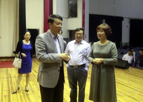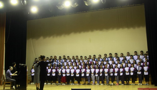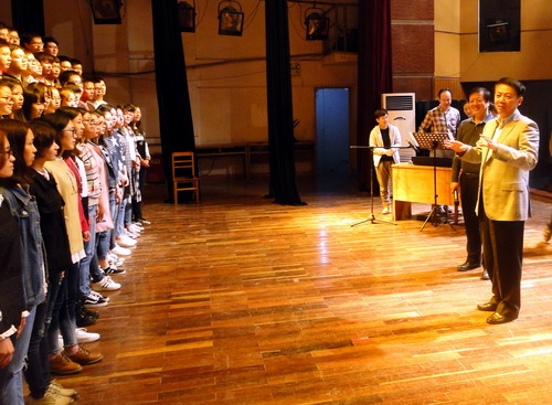 每到一个校区,郑书记都认真地观看了整个排练过程,郑书记一边仔细聆听了同学们的演唱,一边根据音乐的节律打着节拍。在排练的间隙,郑书记走上主席台排练现场,向同学们表示亲切的慰问,并和排练的指导老师探讨排练的相关细节,指出演唱中的某些需要强调和修正的地方。