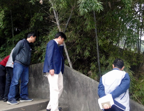 在竞秀楼检查时,发现上坡台阶很陡,台阶右侧竹园内的排污水管断裂,部分竹子枯死,周边气味难闻。杨副校长要求国资处在台阶中间安置一个扶手,方便师生上下。要求国资处和后勤管理处更换台阶右侧竹园内的排污水管,确保没有污水排出。