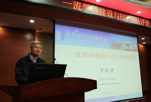 12月1日,应我校图书馆工作委员会邀请,浙江工业大学图书馆研究馆员、汤森路透中国高级顾问万跃华来校做了题为《一流学科建设与ESI学科评价》的学术报告。校党委书记郑翔,副校长王万山、陶春元,学校各职能部门主要负责人、二级学院院长,主管学科、科研的副院长,学科带头人及学术骨干等100多人参加了报告会。报告会由副校长王万山主持。