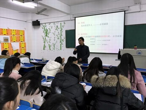 课堂上,廖晓春老师理论联系实际对《老年护理学》进行细致讲解,教态自然,语速适中,条理清晰。