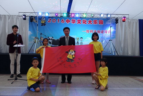 智利当地时间2016年12月14日晚7点30分,由国务院侨务办公室和中国海外交流协会主办、江西省外事侨务办公室和智利北京海外联合会承办、江西省九江学院和江西理工大学具体协办的2016“中华文化大乐园—智利圣地亚哥营”开营仪式在智利圣地亚哥(San Diego)隆重举行,国务院侨务办公室文化司司长雷振刚、中国驻智利大使李宝荣、文化参赞贺踊、商务参赞刘如涛、中国驻智利领事馆副领事于鹏、国侨办文化司华文教育处处长王梦黎、新华社智利分社社长冷彤、智利北京海外联合会会长关金涛、智利中文学校校长Tomas Montecinos Soto、江西省外侨办人事处调研员即江西教师团带队团长周江、旅智各社团和商会的各位侨领们等,以及此次报名参加中华文化大乐园活动的海外华裔青少年一百余人参加此次开营仪式。