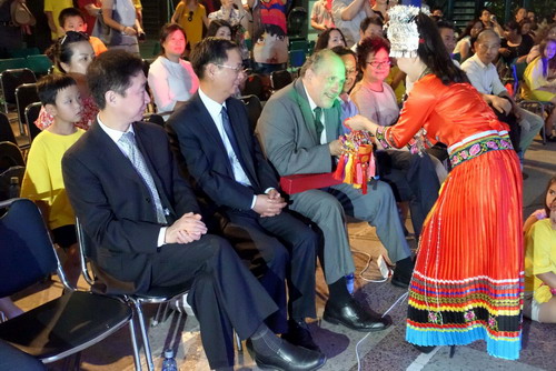 随后,江西教师代表团的各位教师依次给大家带来了武术、舞蹈、书画、剪纸、琵琶弹奏、豫剧、魔术表演、古诗吟诵、茶艺和集体歌伴舞等形式多样、内容丰富的演出节目,给大家呈现了一场高雅的中国传统文化魅力的视听盛宴,其中既有身手不凡的武术表演,巾帼不让须眉的风采展现的淋漓尽致;也有婀娜灵动的民族舞蹈表演、把江南女子的柔美娇羞呈现的惟妙惟肖;还有精彩的书画剪纸和琵琶弹奏合演,让大家在短时间内一睹了中国古典琴棋书画艺术的高雅情趣及魅力;一个个神奇的魔术表演让场下的观众们连连称赞;一曲《霓裳古韵》吟诵及旗袍秀展示仿佛带大家穿越到了“青青子衿,悠悠我心”的古风年代,各位女教师成员身着古典旗袍,手持蒲扇,吟吟细语,把中国女性特有的柔美和端庄展现的异常生动;最后一曲集体歌伴舞《爱我中华》把全场气氛拉向高潮,教师们纷纷把台下的观众请上舞台一起踏着欢快的旋律跃动起来,这种互动顿时带动了全场,现场一片喜气祥和。