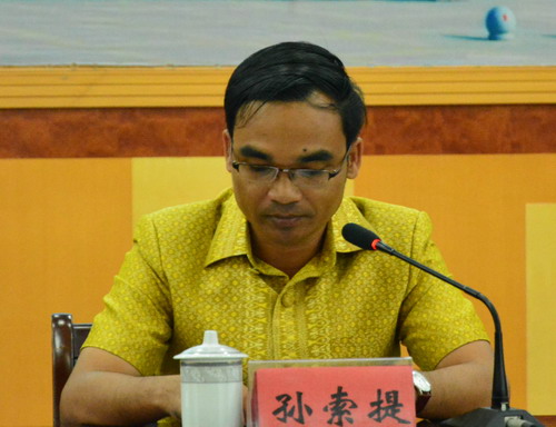 本次冬令营和体验团领队代表柬埔寨亚欧大学副校长孙索提在欢迎仪式上致辞。他首先对九江学院的热情接待表示感谢。他说,九江学院和柬方合作在柬埔寨设立孔子学院,每年选派优秀教师赴柬埔寨传授中国语言文化知识,并承接多批次来华文化体验团组,为柬埔寨学生创造了良好的学习和体验中国语言文化的机会。他对九江学院一直以来支持柬埔寨孔子学院的发展和中柬文化交流所作出的努力表示由衷的感谢。