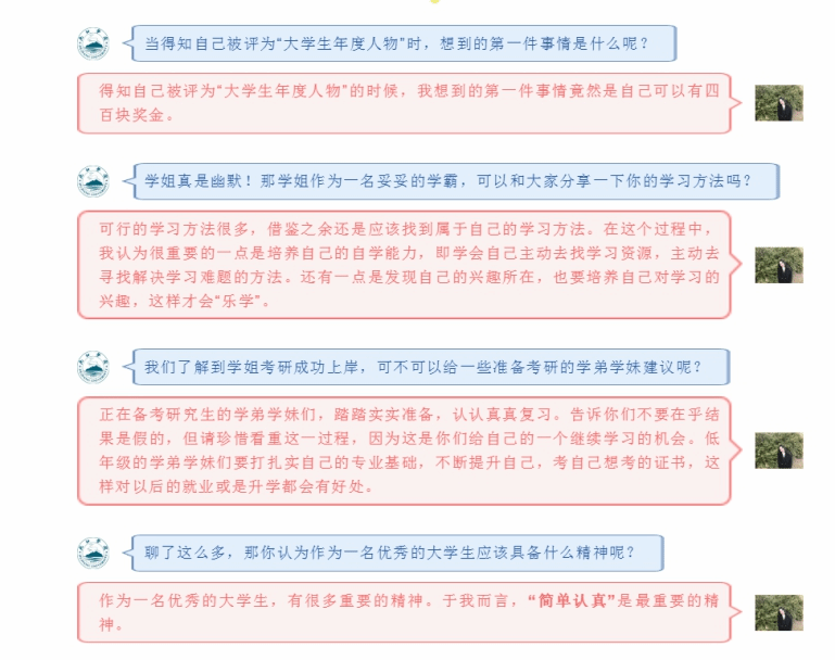 在考研这个问题上,邱淼洋说,考研前和考研后改变最多的是心态。备考的时候难免会因为疲劳和考虑结果太多而导致的心理压力而心烦意乱,但现在回头看,很多时候都是自己在吓自己,自己在胡想。其实,认认真真复习,对得起自己就可以了。“就算一次没考上又怎样?想做就去做,不行再说呗,年轻呢!”