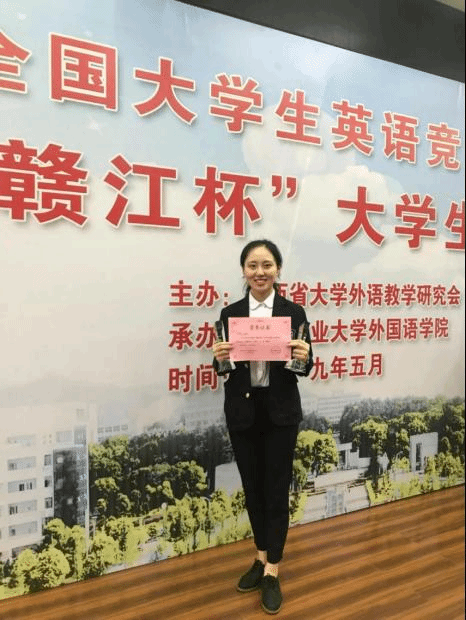 除了课本学习以外,邱淼洋还积极参加比赛,并在各项比赛中脱颖而出:荣获2018年全国大学生英语竞赛初赛一等奖、2018年江西省第十届大学生翻译大赛一等奖、2018年江西省“赣江杯”大学生英语竞赛二等奖、演讲比赛二等奖等多个奖项。这些不仅是一次次比赛,更是学习的扩充,是人生的阅历,是难以忘怀的独特记忆。