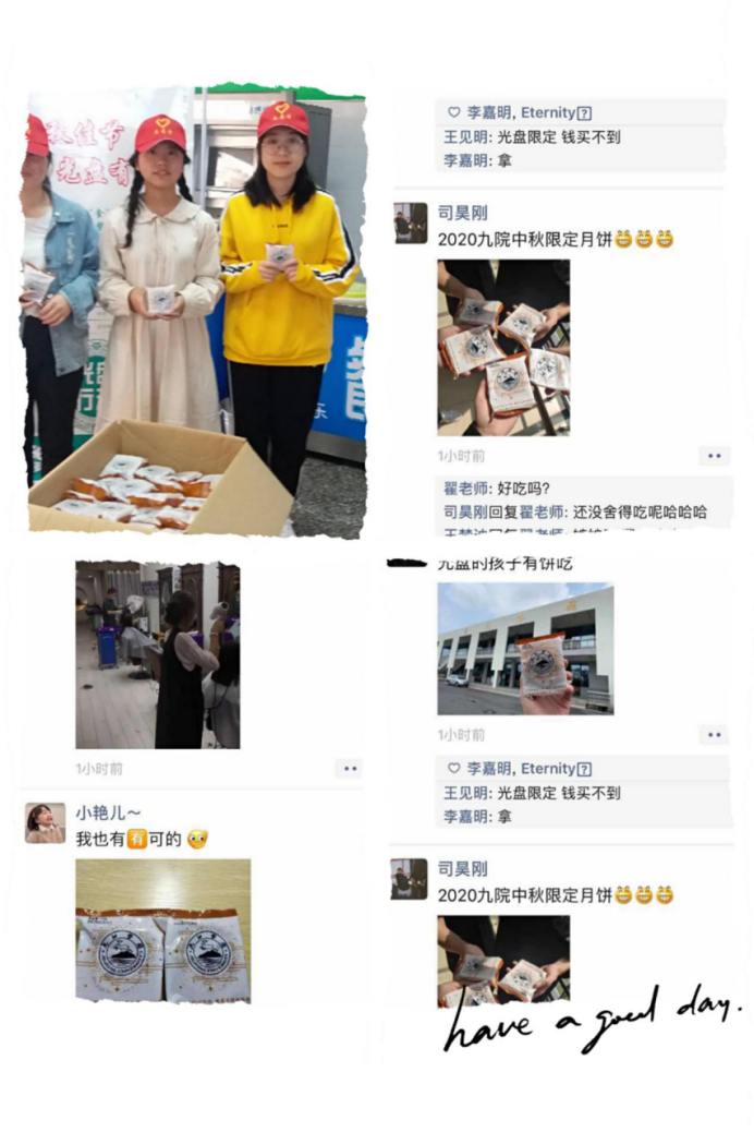 三天的时间里,饮食服务中心各食堂共发出月饼30000多枚。一位退休老教师在九院后勤公众号里留言道:“一轮明月,一块月饼,莘莘学子情,殷殷母校心!为九江学院3万多学子们祝福,为九江学院暖心的服务点赞”。吃到月饼的同学们也纷纷表示,学校发的月饼让我们吃出了家的温暖,不出校园让我们感受到了节日的氛围,体验到了学校的领导和老师们的关怀,感谢食堂师傅们的辛勤付出,感谢学校带给我们的浓浓情谊。