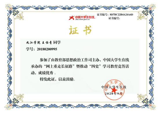 药学与生命科学学院组织学生积极参与了“网上重走长征路”活动暨“四史”知识竞赛活动,通过“中国大学生在线”公众号进入“四史”教育答题,参加此次活动的学生主要包括学院全体学生会成员、入党积极分子、20届全体学生以及19届的班长和团支书等,总人数达至515人。同学们在参加此次“四史”学习教育竞赛活动中,答题成绩优秀,并荣获相关证书。通过此次竞赛活动,同学们深入学习贯彻习近平总书记关于学校党建和思政工作的重要指示批示精神,深入学好党史、新中国史、改革开放史、社会主义发展史,深刻理解了长征路走的不只是一条创造军事史奇迹的路线,也是党战胜自己的组织建设之路、信仰坚定之路。
